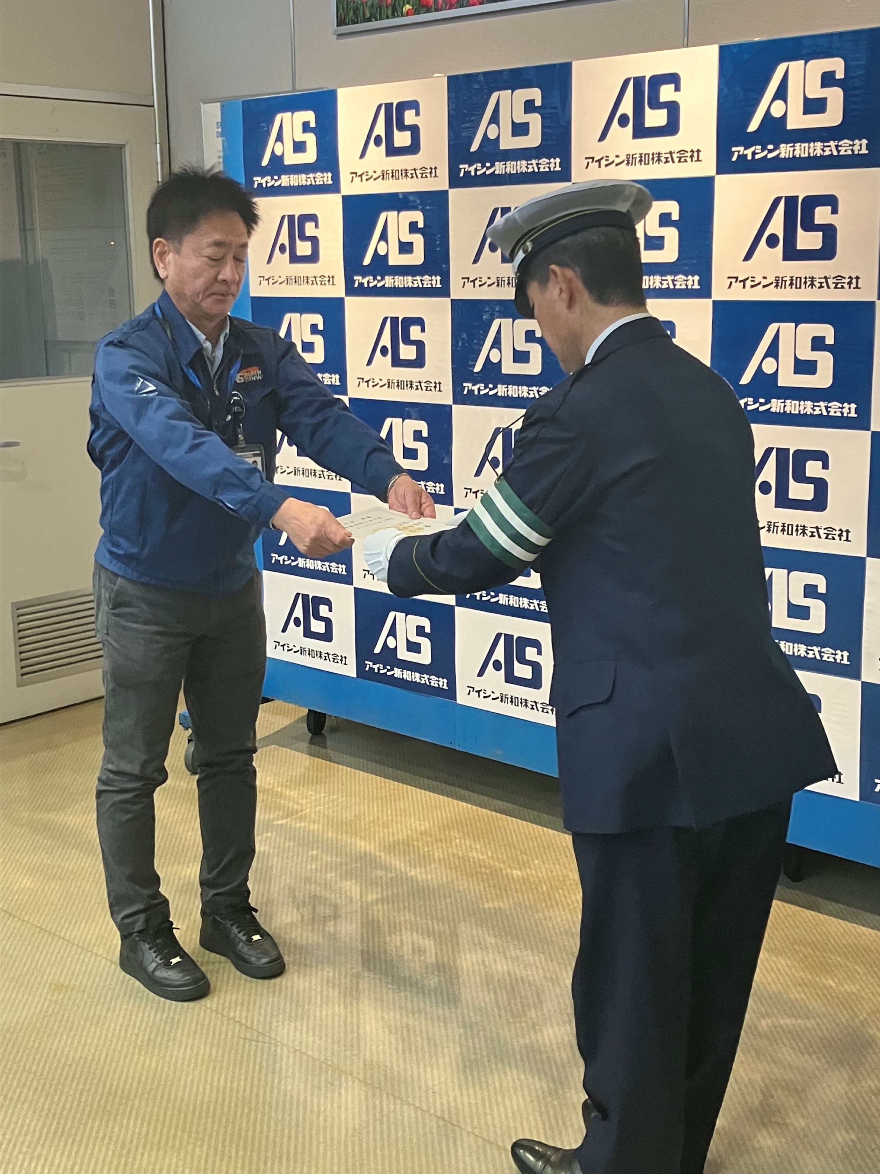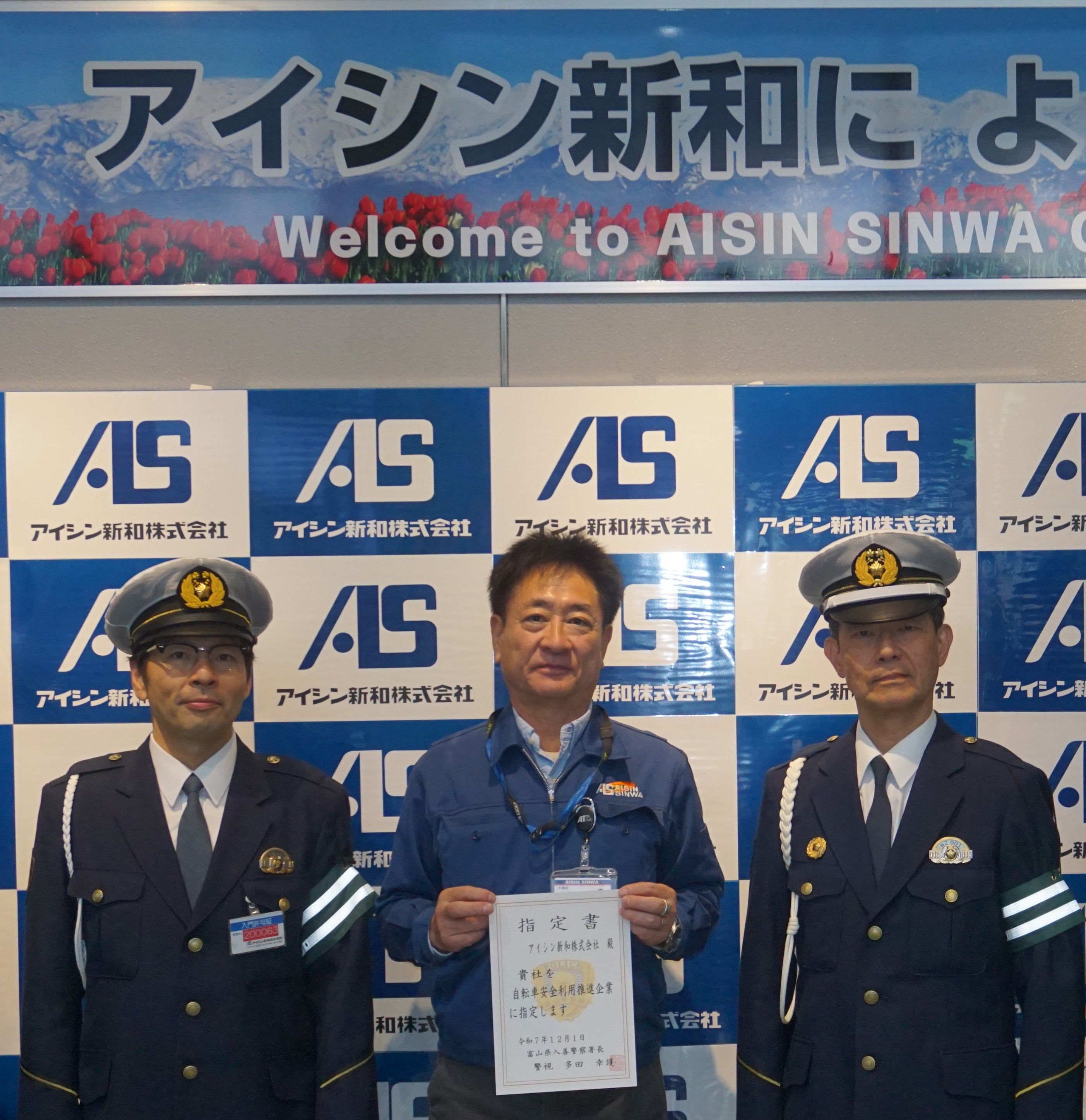 当日、安藤社長が入善警察署の多田署長から「自転車安全利用推進企業」指定書の交付を受けました。
